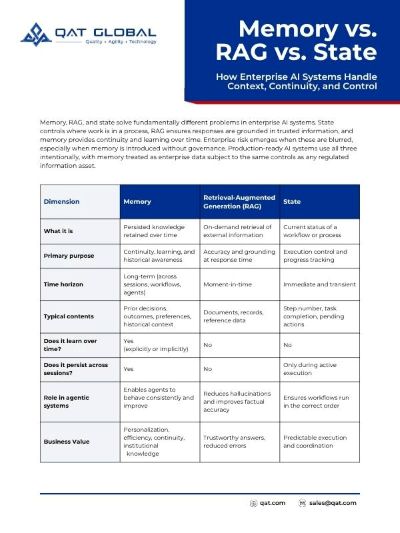 Enterprise systems need to clearly manage both state and memory. Mixing them up causes confusion, errors, and risk. State management ensures workflow progress, while memory management ensures agents learn and improve over time without creating compliance exposure.